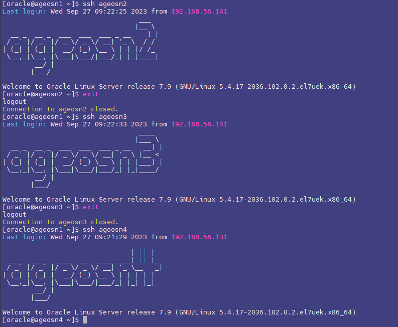 Controleer of se ssh toegang naar de verschillende nodes als user oracle in orde is. Onderstaande screenshot laat zien dat vanaf ageosn1 dit in orde is.