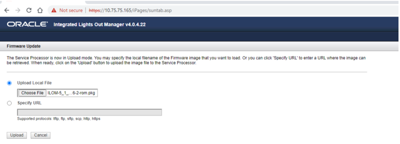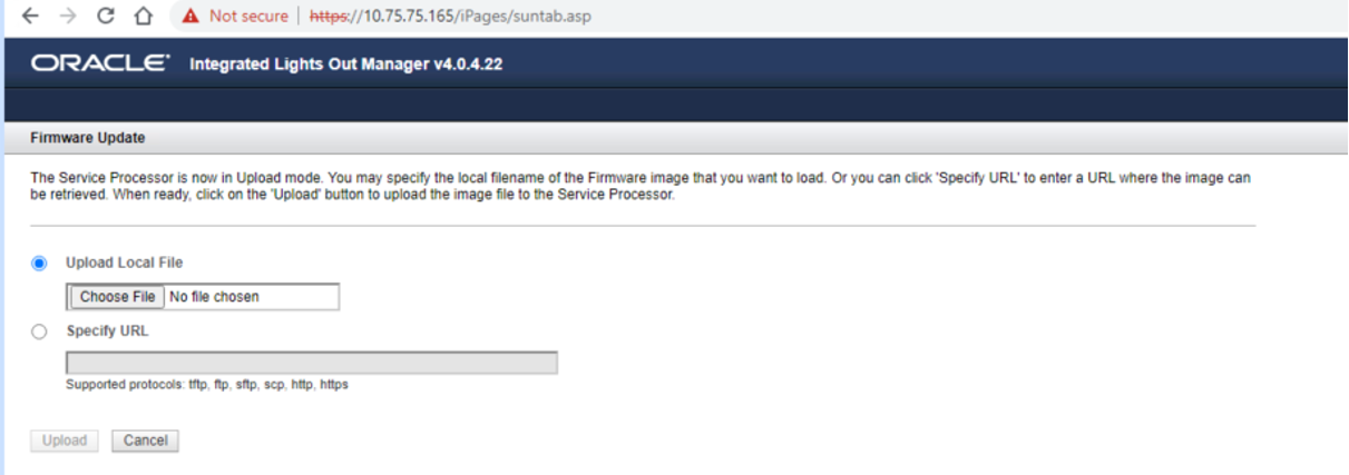 Vervolgens ga je in de ILOM naar ‘ILOM Administration’ menu ‘Maintanance’ en kies daar voor ‘Enter Update Mode’