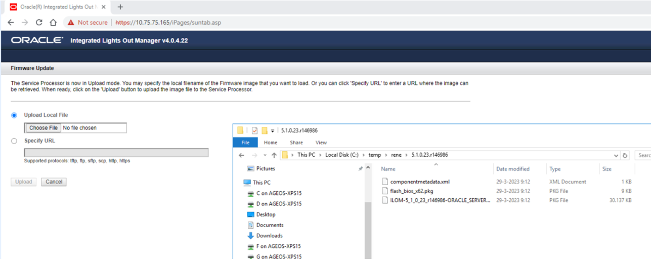 Hier kies je ILOM-5_1_0_23_r146986-ORACLE_SERVER_X6-2-rom.pkg, de dile die je overgehaald hebt naar je locale schijf.