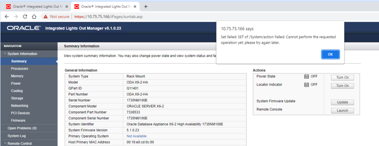In de ILOM wordt aangegeven dat de machine ge-reboot wordt. Na het rebooten van de ILOM staat de database node uit en moet deze via de ILOM aangezet worden. Je ziet dan ook dat de versie van de ILOM veranderd is t.o.v. de vorige screenshots.