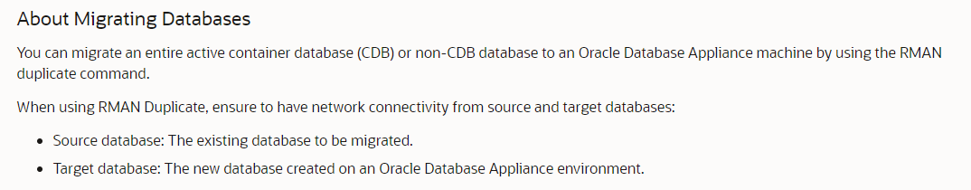 In de ODA documentatie (https://docs.oracle.com/en/engineered-systems/oracle-database-appliance/19.8/cmtxn/index.html) staat dat het mogelijk is een bestaande database naar ODA database te migreren door een nieuwe database aan te maken m.b.v. RMAN duplicate.