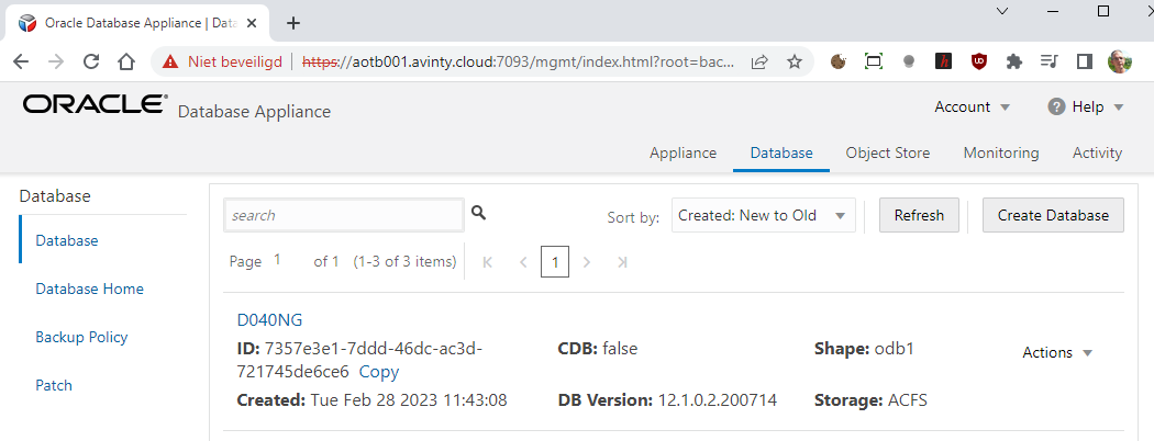 De huidige PRD databases zijn niet aangemaakt op de ODA manier. Hierdoor is het ook niet mogelijk om deze database op een ODA manier te updaten naar 19C. Het is ook niet mogelijk de backup en recovery manier op de ODA manier te doen. Het is mogelijk om een bestaande database op een ODA machine te registreren als ODA database. Dit werk helaas alleen voor single instance databases, niet voor RAC.