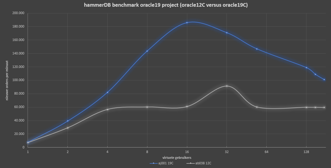 Dit artikel beschrijft een hammerDB test die is uitgevoerd op de aj001.wolk.care databaseserver op RAC database CA040P in het kader van een migratie naar oracle9c. Er wordt gebruik gemaakt van de OLTP variant, waarmee een order-entry systeem wordt gesimuleerd met een aantal concurrent (virtuele) users. Het aantal (virtuele) users wordt verderop uitgelegd.