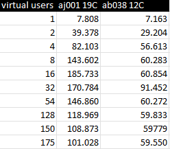 De benchmark wordt uitgevoerd m.b.v. script D040Prun.tcl en simuleert een warehous order entry sytsteem met foreach z { 1 2 4 8 16 32 64 128 150 175 } concurrent users.